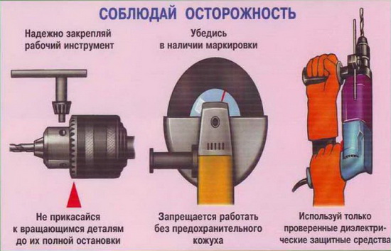При работе с таким инструментом как болгарки, штроборезы, бензотримеры, перфораторы, отбойные молотки – следует одевать плотную одежду, обязательно, защитные очки, чтобы не повредить глаза, наушники и плотные перчатки, которые обеспечат безопасность Ваших рук.